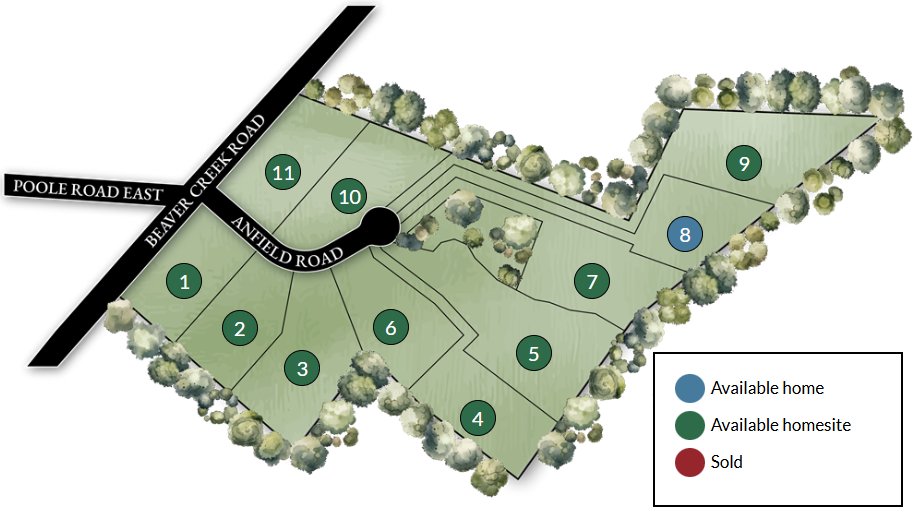 Explore the site map of Anfield Estates, a luxury custom home community in New Hill, NC, near Jordan Lake. Surrounded by protected U.S. Army Corps of Engineers land, Anfield Estates offers a rare blend of privacy and natural beauty. Start planning your dream home today in one of the Triangle's most desirable new communities.